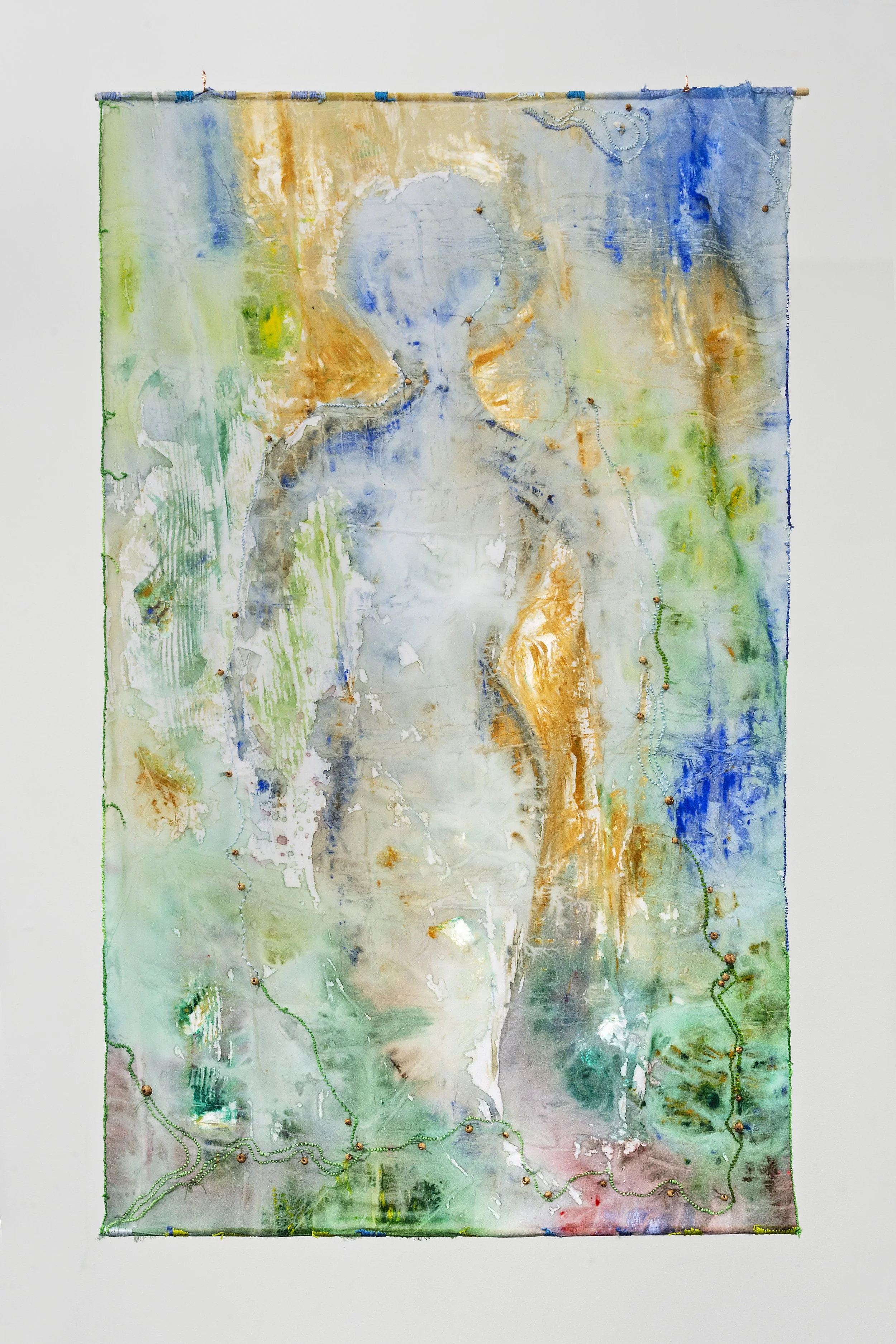 Installation images of “Beyond the Bedrock,” a 3 person exhibition with Yasmeen Abdallah & Katrina Slavik at PS122 Gallery in New York, New York, 2025 (curated by Katrina Slavik). Through installation, assemblage, textiles, painting, and food, the exhibition considers our role in consumption and decomposition. My materials and methods included gleaning local urban soils and assembling found materials that reference theories of the anthropocene in the earth. These processes were inspired by research at recent residencies, Wave Hill in the Bronx and Swale on Governors Island, NYC. Photography by Stefan Hagen.
